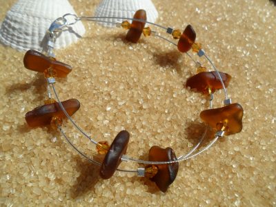 Amber sea glass with amber crystal beads threaded on 7″ of .022 nylon coated wire with sterling silver stoppers and trigger clasp.