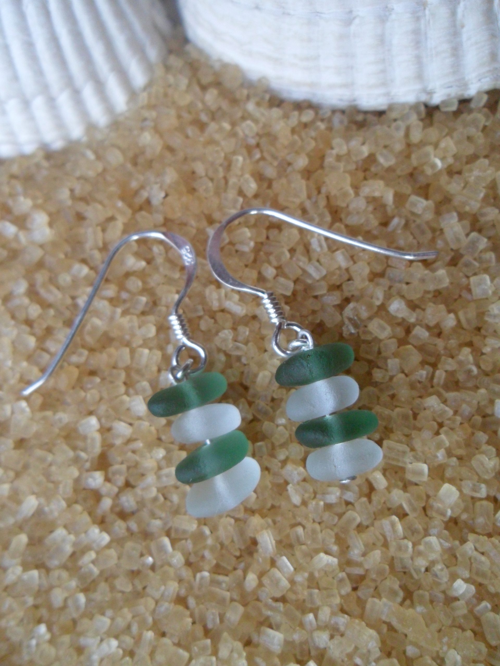 Olive green and seafoam sea glass ‘quad stack’ effect earrings. Hanging from sterling silver hook earrings.