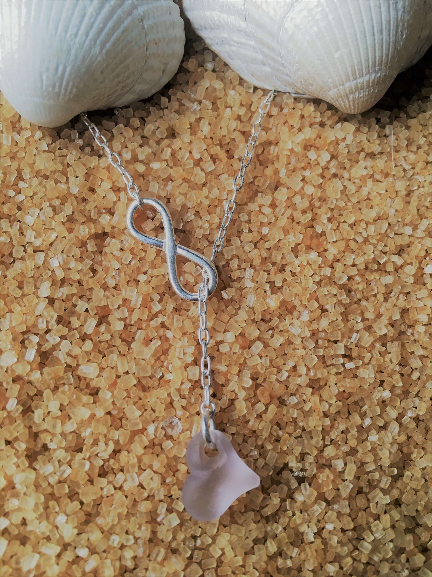 Sea glass with inset gem crystal hanging from 16″ sterling silver trace chain threaded through sterling silver ‘Infinity’ charm