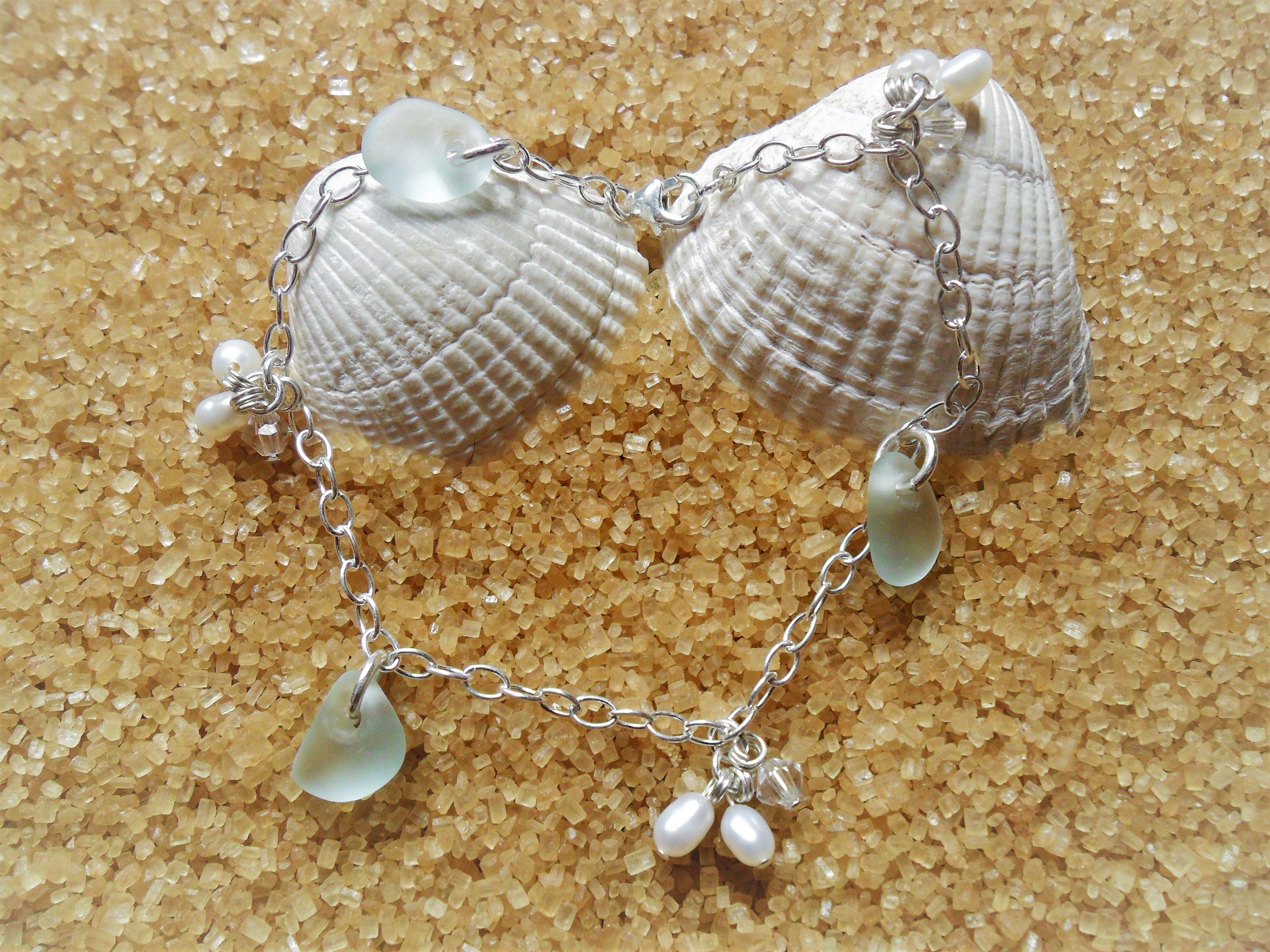 Aqua marine sea glass together with cream freshwater pearls and clear crystal beads , linked onto 7” sterling silver ‘link’ bracelet.