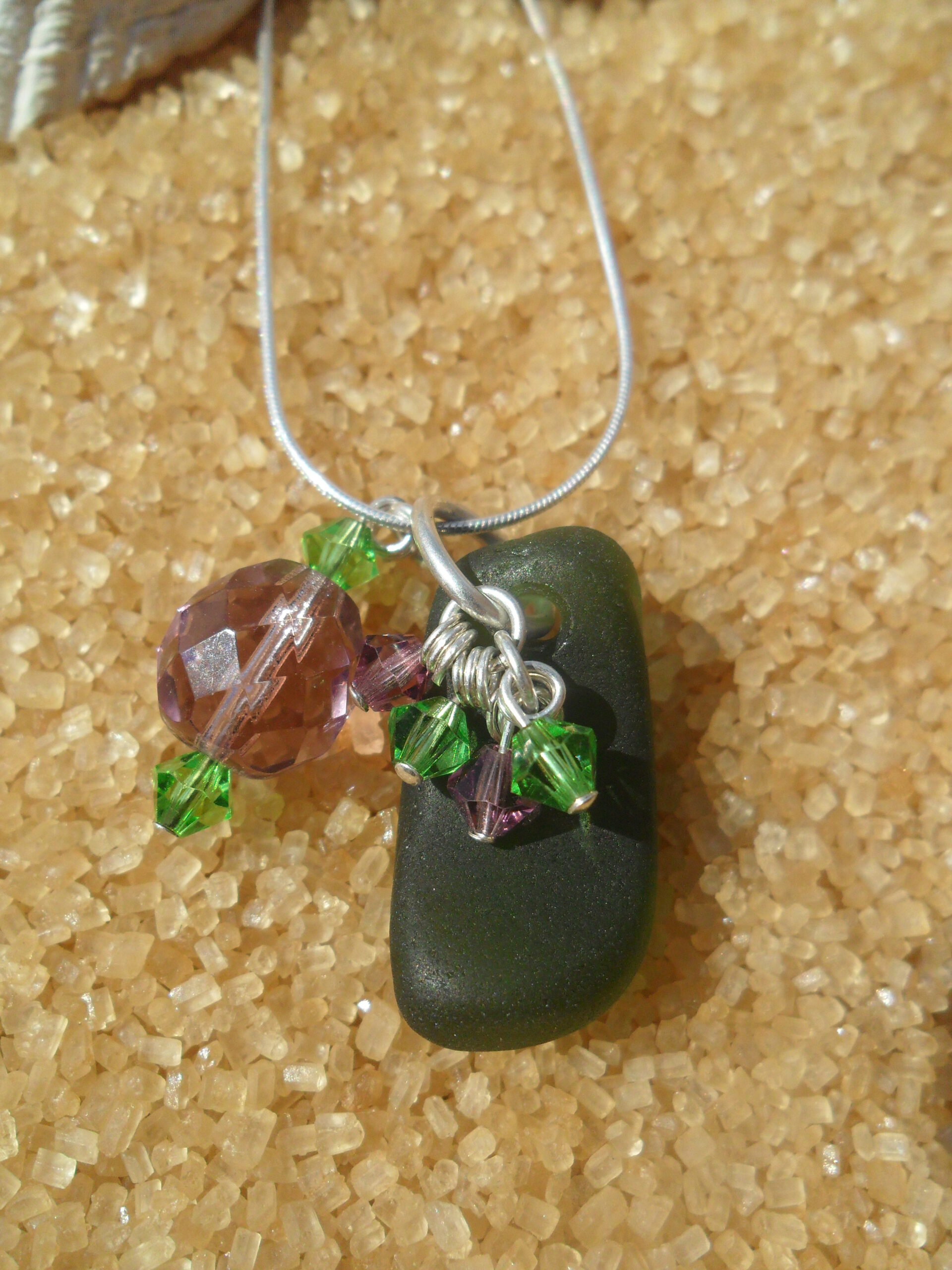 Olive green sea glass pendant with green and deep lavender crystal cluster charm and deep lavender glass facet and green crystal ‘thistle’ charm, on 18″ sterling silver snake chain.