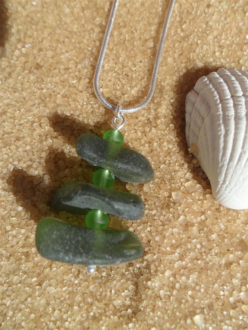Olive green sea glass ‘stack’ pendant with green frosted glass beads. Simply hanging from 18” sterling silver snake chain.